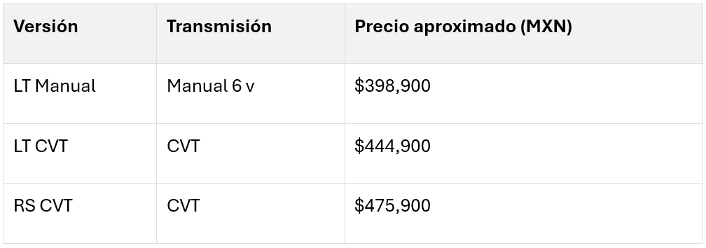 La versión LT Manual funciona como entrada a la gama, con el motor turbo, pantalla de 10.25”, conectividad smartphone y el grueso de los sistemas de seguridad esenciales. La LT CVT añade la comodidad de la transmisión automática y más amenidades, mientras que la RS CVT suma una apariencia más deportiva, mejor equipamiento y detalles estéticos específicos.